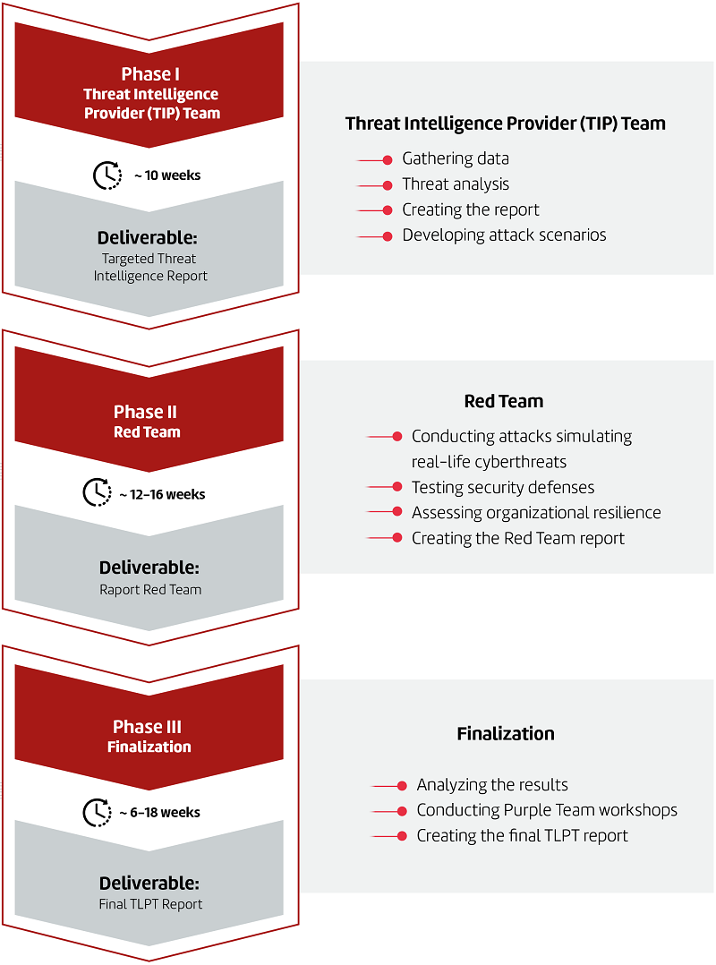 To ensure comprehensive execution of TLPT services in compliance with DORA regulations, Securitum works with two independent teams in three phases:
